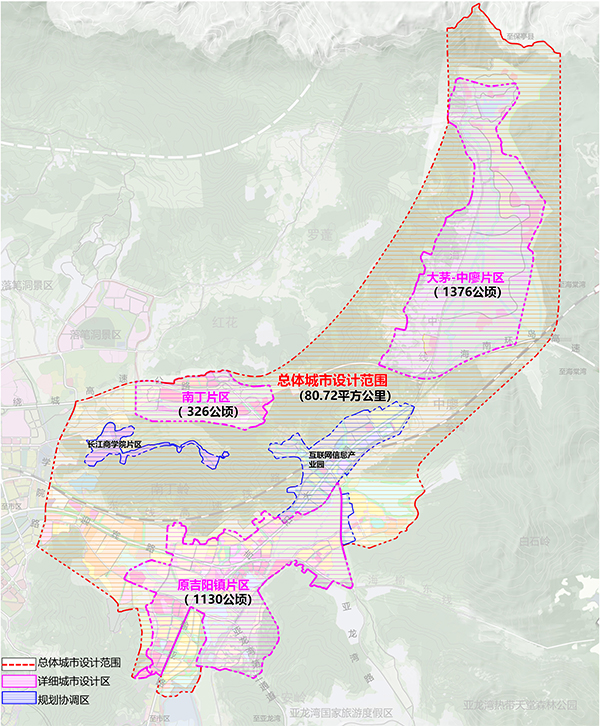 詳細(xì)城市設(shè)計(jì)包括3個(gè)片區(qū),總面積約2832公頃。其中,原吉陽(yáng)鎮(zhèn)片區(qū)面積約1130公頃,南丁片區(qū)約326公頃,大茅-中廖片區(qū)約1376公頃(詳見(jiàn)規(guī)劃范圍示意圖)。