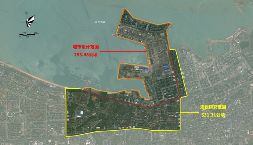 城市設計范圍為秀英港核心區(qū)域:東起麗晶路、西至國帆基地碼頭、南接濱海大道、北臨瓊州海峽,面積約253.48公頃。