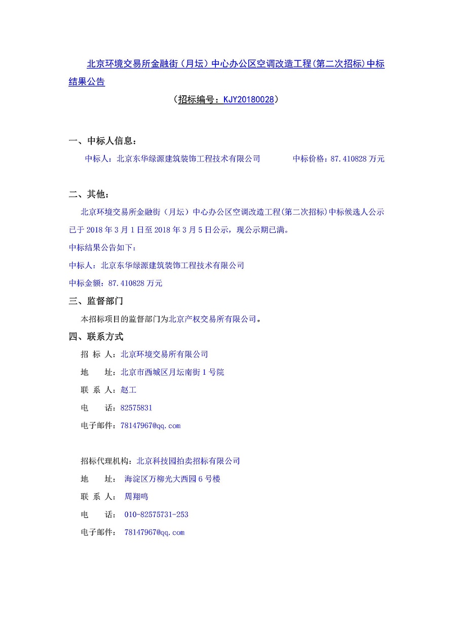 北京環境交易所金融街(月壇)中心辦公區空調改造工程(第二次招標)中標結果公告