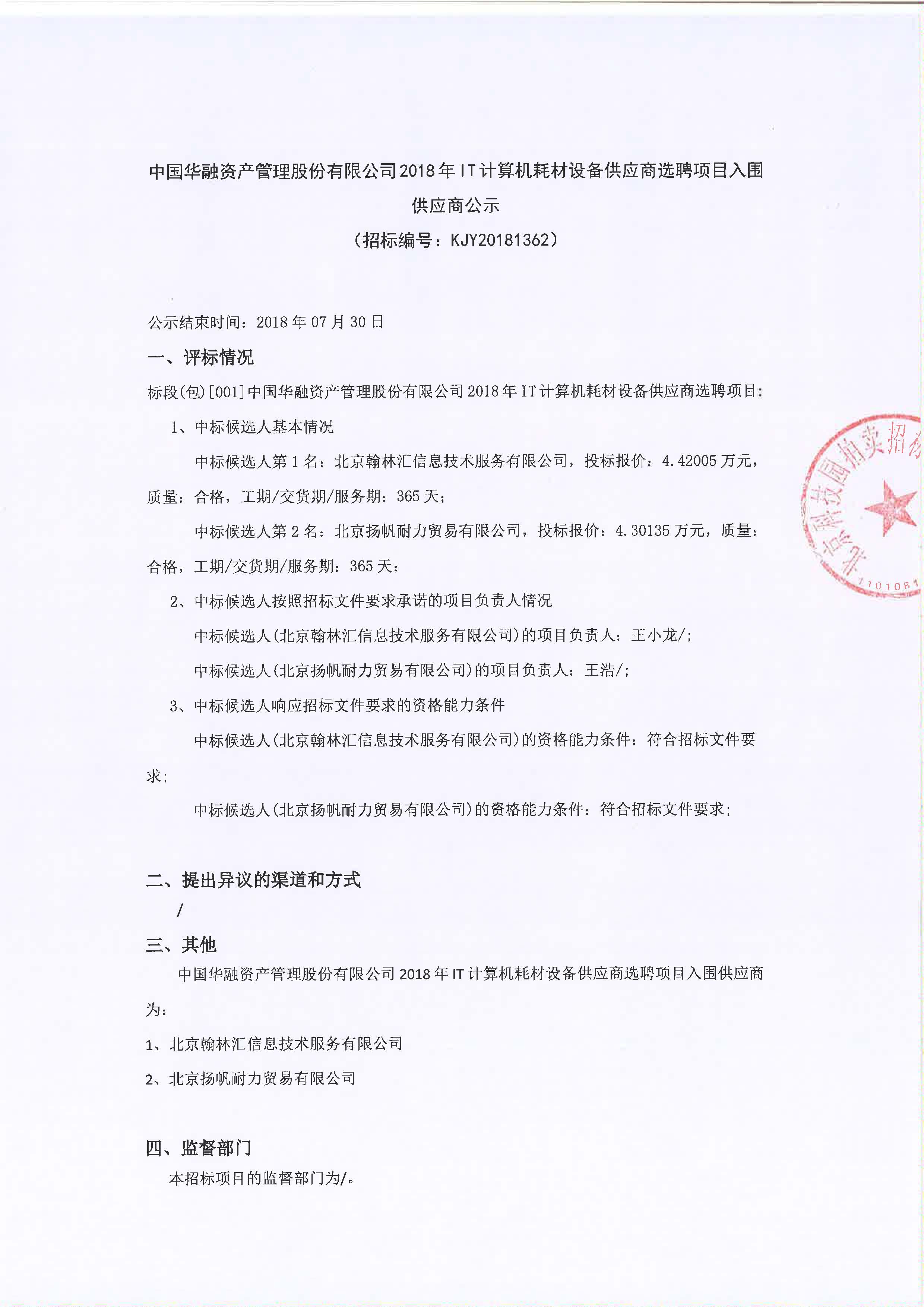 中國華融資產管理股份有限公司2018年IT計算機耗材設備供應商選聘項目入圍供應商公示